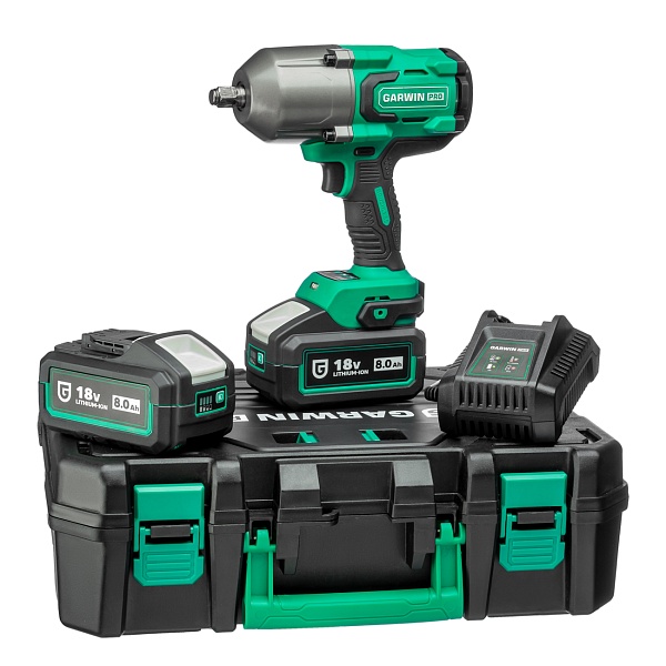 Аккумуляторный гайковёрт от GARWIN PRO поставляется в пластиковом кейсе в комплекте с двумя литий-ионными аккумуляторами ёмкостью 8 Ач и зарядным устройством.