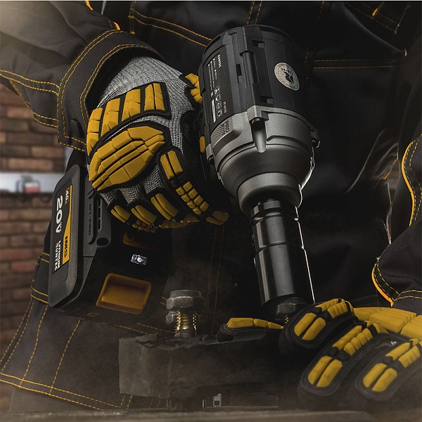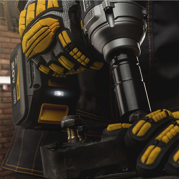 Эргономичный корпус и прорезиненная рукоять с 3D текстурой обеспечивает удобный хват и не позволит выскользнуть инструменту даже при работе в перчатках. Мы сделали гайковерт максимально легким и компактным: вес с батареей всего 1.8 кг. Это не только сделает продолжительную работу проще, но и позволит использовать его в труднодоступных местах. Корпус гайковерта усилен дополнительными ребрами жесткости для увеличения прочности. В корпусе инструмента расположена светодиодная подсветка для удобной работы в условиях низкой освещенности. Чтобы избежать потерю крепежа, гайковерт оснащен функцией автоматической остановки: при достаточном ослаблении крепежа инструмент остановится.