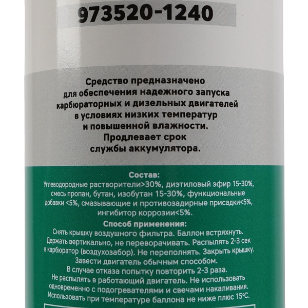 Приобретая этот продукт, вы получаете высококачественное средство для зимнего запуска двигателей, которое обеспечит надёжную работу вашей техники в любых погодных условиях. Аэрозольный быстрый старт станет вашим надёжным помощником в борьбе с зимними морозами и обеспечит лёгкий запуск двигателя в любую погоду.