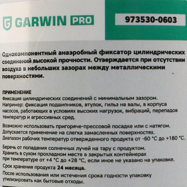 Фиксатор подшипников (вал-втулочный) быстроотверждаемый GARWIN PRO 50 мл — это профессиональный фиксатор для подшипников анаэробного типа, обеспечивающий надежную фиксацию цилиндрических соединений. Используется для фиксации вал-втулочных соединений в условиях высоких нагрузок и вибраций.