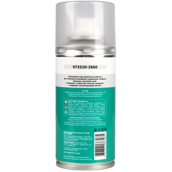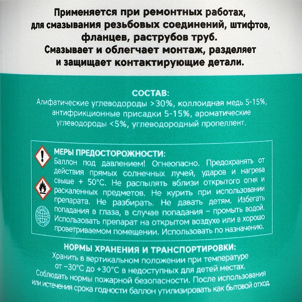 Медные частицы в составе предотвращают сваривание и прикипание деталей, значительно облегчая последующий демонтаж резьбовых соединений.
