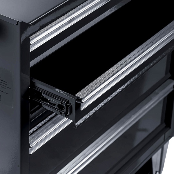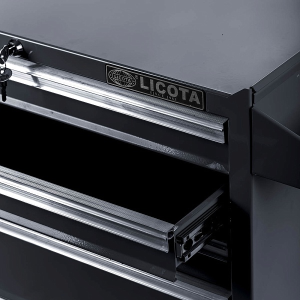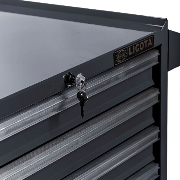 Система Easy lock предотвращает самопроизвольное открытие полок. Центральный замок предусмотрен для блокировки всех полок одновременно. Съёмный карман на корпусе тележки предназначен для хранения емкостей с техническими жидкостями.