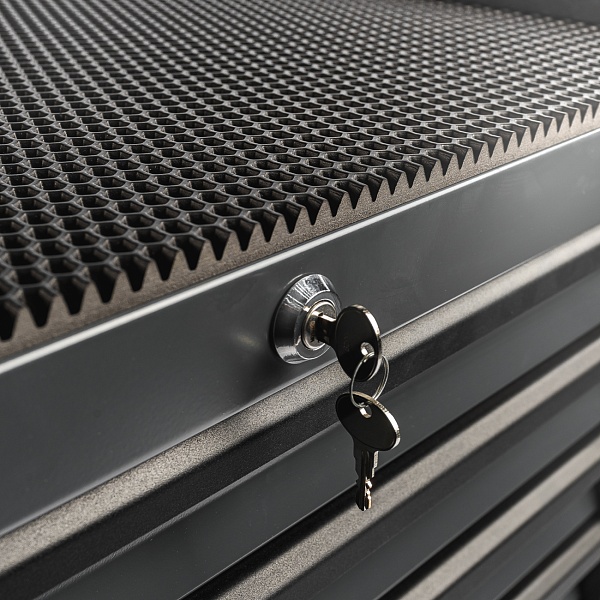 Текстурные ручки ящиков для удобного использования в перчатках. Центральный замок для защиты содержимого от несанкционированного доступа. Толщина металла — 1.2 мм, что гарантирует прочность конструкции и долговечность в условиях интенсивной эксплуатации.