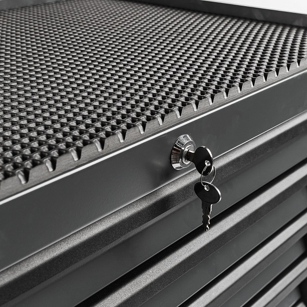 Текстурные ручки ящиков для удобного использования в перчатках. Центральный замок для защиты содержимого от несанкционированного доступа. Толщина металла — 1.2 мм, что гарантирует прочность конструкции и долговечность в условиях интенсивной эксплуатации.