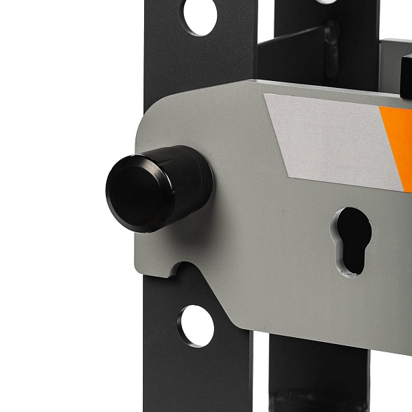 Широкое Н-образное основание надежно крепится к поверхности анкерным болтами, что исключает раскачивание и падение пресса. Для защиты от перегрузок предусмотрен встроенный предохранительный клапан. V-образные блоки с фиксаторами по бокам позволяют надежно закрепить обрабатываемую деталь.