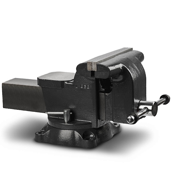 Тиски рассчитаны для работ в условиях повышенной нагрузки. Массивная конструкция позволяет избегать деформации инструмента. Поворотный механизм позволяет разворачивать тиски на 360°. С помощью площадки-наковальни можно быстро отрихтовать нужную деталь.