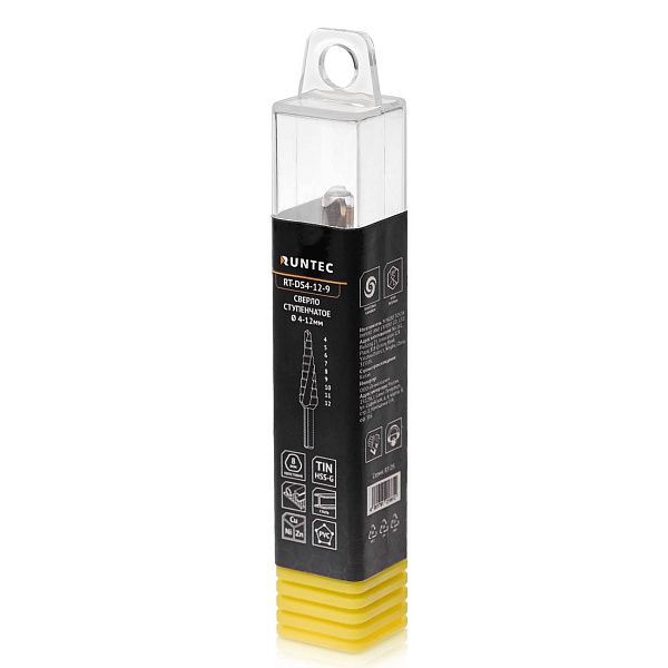 Сверло ступенчатое RUNTEC 4-12 мм, 9 ступеней, HSS-TiN, RT-DS4-12-9
