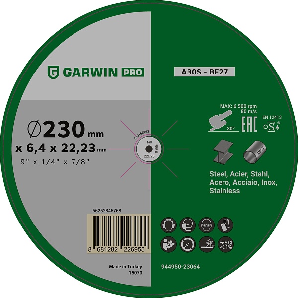 Круг зачистной A30S-230x6.4x22.23-T27 мет/нерж (Польша), GARWIN PRO, 944950-23064P