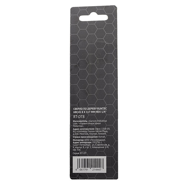 Сверло по дереву Runtec HRC45 8 x 117 мм HEX 1/4", RT-DT8