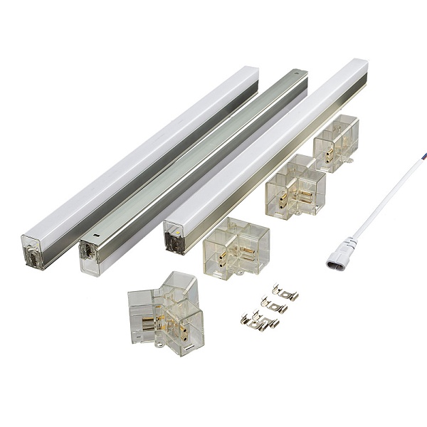 Модульная структура обеспечивает легкую сборку и монтаж. В комплекте все необходимое: лампы, коннекторы разных видов, шнур питания и скобы для крепления.