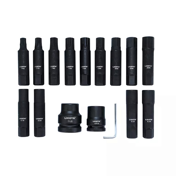 Набор бит Licota ATF-5219 из хром-молибденовой стали состоит из 16 предметов с рабочими профилями для крепежа с разными типами головок. В универсальный набор входят: насадки HEX (шестигранники наружные), насадки TORX (наружные), насадки E-профиля (внутренние). Длина насадок - 107 мм. В комплекте две торцевых головки-адаптера для бит (на ¾ дюйма и 1 дюйм) и Г-образный шестигранный ключ на 4 мм.