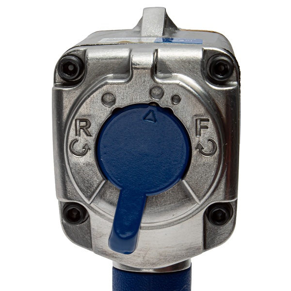 Рычажок переключателя скоростей выполнен из металла и находится в задней части корпуса. Переключатель имеет плавный ход и расположен в углублении, что позволяет ставить гайковерт вертикально. Три режима работы (2 на закручивание и 1 на откручивание) обеспечивают комфортную работу с резьбовыми соединениями разных размеров.