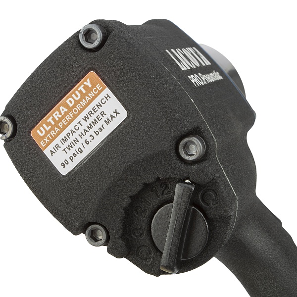 Корпус гайковерта выполнен из алюминиевого сплава, что обеспечивает высокую прочность при небольшом весе. При крутящем моменте 1898 Нм инструмент весит 4,5 кг и имеет длину 210 мм.