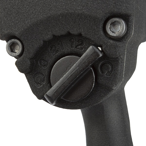 Переключатель скоростей расположена в задней части корпуса. Шесть режимов работы (3 на закручивание и 3 на откручивание) обеспечивают комфортную работу с резьбовыми соединениями разных размеров.
