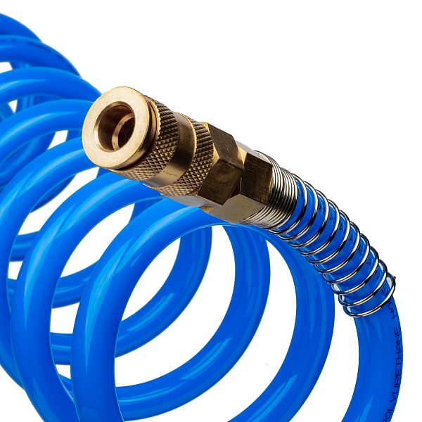 Упругая спираль шланга не создает неудобств оператору пневмоинструмента, и после завершения работ принимает прежнюю форму.