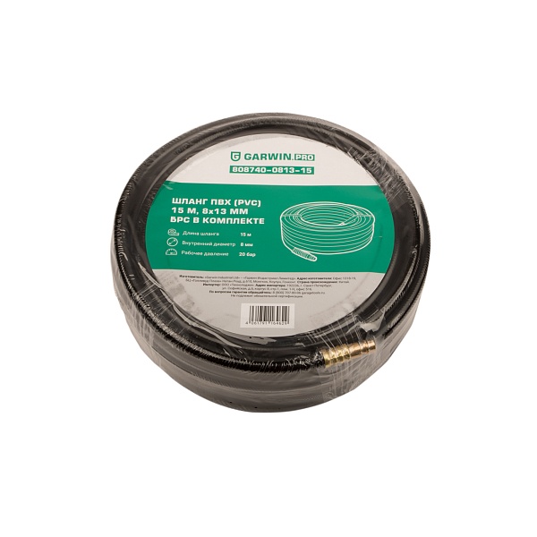 Шланг ПВХ (PVC) 8*13, 15 м, черный, БРС в комплекте, в бухте, GARWIN PRO, 808740-0813-15