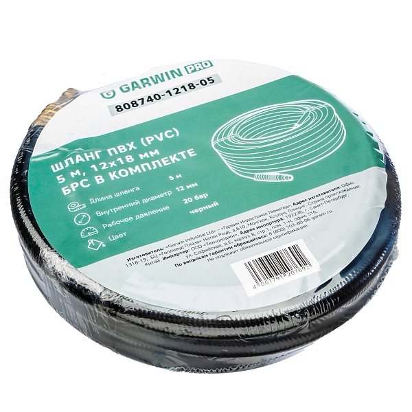 Шланг ПВХ (PVC) 12*18, 5 м, черный, БРС в комплекте, в бухте, GARWIN PRO, 808740-1218-05