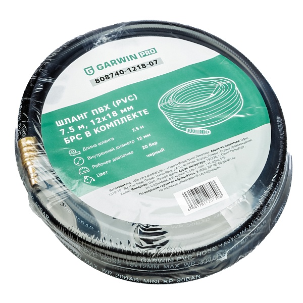 Шланг ПВХ (PVC) 12*18, 7,5 м, черный, БРС в комплекте, в бухте, GARWIN PRO, 808740-1218-07