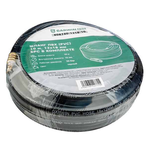 Шланг ПВХ (PVC) 12*18, 10 м, черный, БРС в комплекте, в бухте, GARWIN PRO, 808740-1218-10