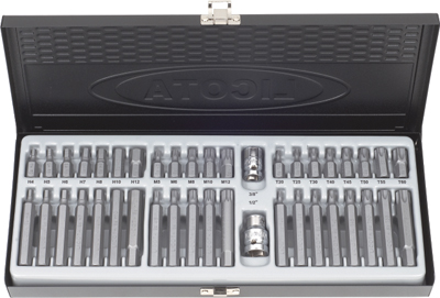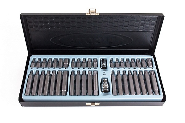 В набор входят биты с хвостовиком 10 мм с рабочими профилями HEX, Torx, Spline и переходники к ним с присоединительными квадратами 3/8” и 1/2”. Каждый размер представлен инструментом длиной 30 мм и 75 мм.