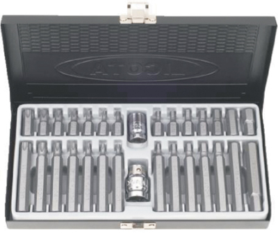 Комплект из 28 бит и 2 переходников используется для работы с крепежом с внутренними профилями Torx и HEX (шестигранник).