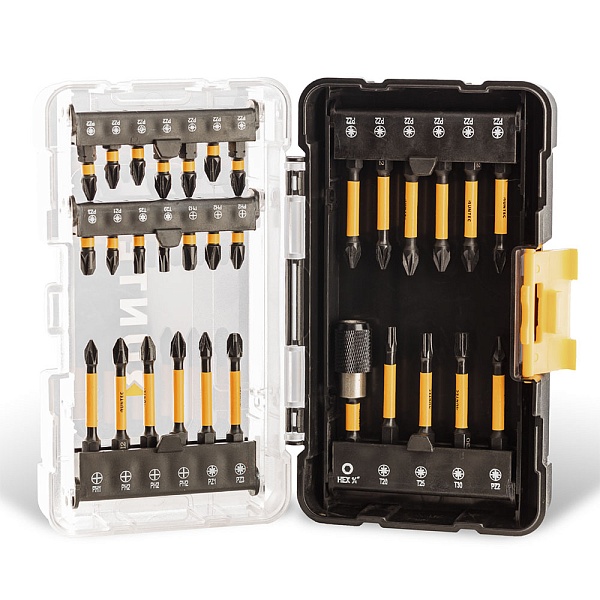 Набор ударных бит для интенсивной профессиональной работы. В наборе представлены типоразмеры, которые позволяют проводить монтажно-демонтажные работы широкого спектра. Благодаря возможности выдерживать высокие нагрузки, идеально подходит для использования с электроинструментами с тангенциальным ударом. Может использоваться как с ударными, так и с обычными инструментами. Наружный шестигранный хвостовик HEX - E 1/4" (6.35 мм).