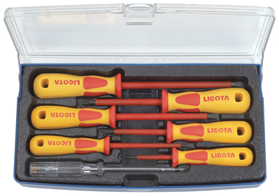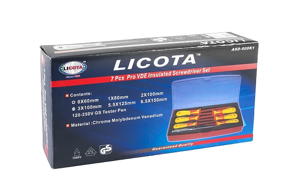 Набор диэлектрических отверток Licota ASD-900K1 из 7 предметов в пластиковом кейсе. В комплект входят 3 отвертки с профилем SL (шлиц), 3 отвертки с профилем PH (крест) и пробник напряжения.