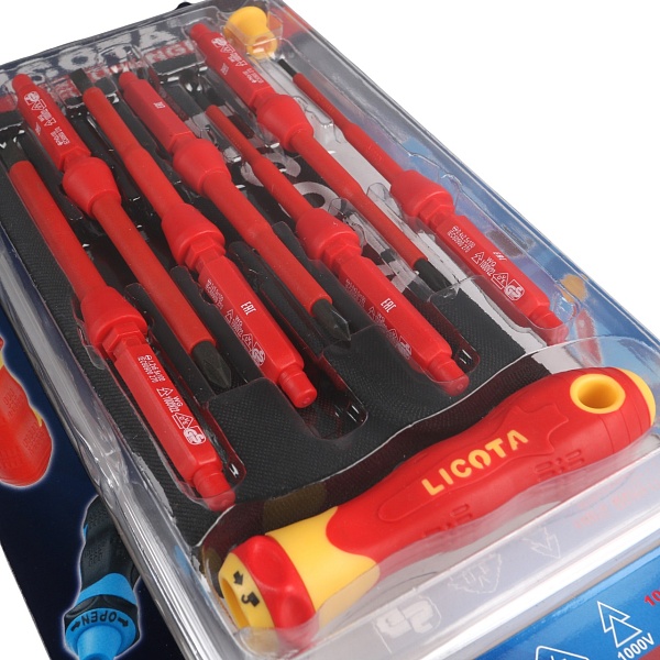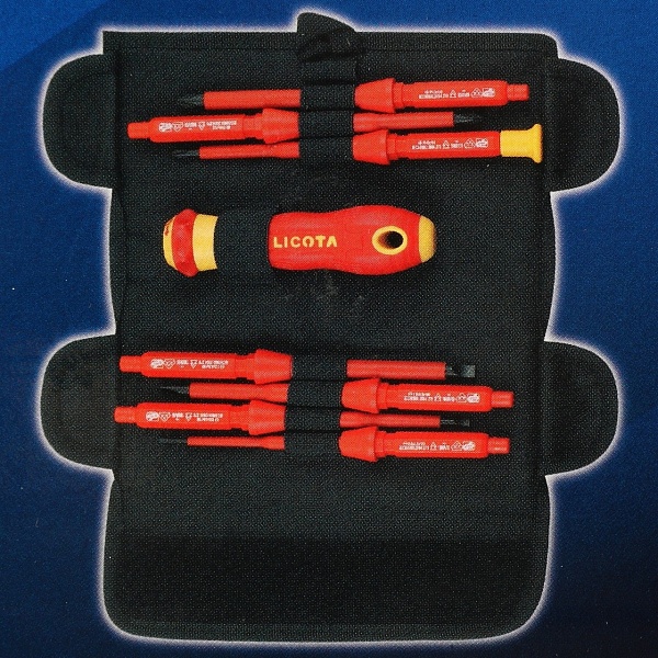 Отвертка диэлектрическая со сменными вставками Licota ASD-CVS101K, набор из 8 предметов. В комплект входят 4 жала с профилем SL (шлиц), 3 жала с профилем PH (крест) и двухкомпонентная рукоятка-держатель. Длина сменных жал - 100 мм.
