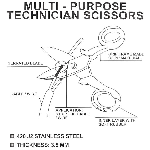 Ножницы изготовлены из прочной стали с индукционной закалкой. Твердость лезвий позволяет резать медные провода диаметром до 3,5 мм.