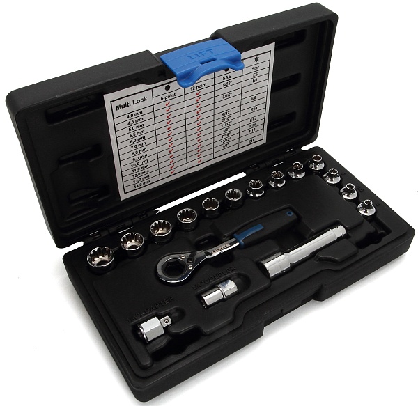 Кроме того, рабочий профиль головок Spline повышает функциональность набора, такой профиль позволяет работать как с обычным шестигранным крепежом, так и с 12-гранным, TORX, а также им можно крутить крепеж дюймовых размеров. В наборе есть и переходник, установив который в трещотку, можно работать головками с обычным квадратным приводом размером 1/4", а также адаптер под биты с хвостовиком 1/4". Удлинитель на 75 мм для головок входящих в набор, позволит работать с глубоко посаженным крепежом.