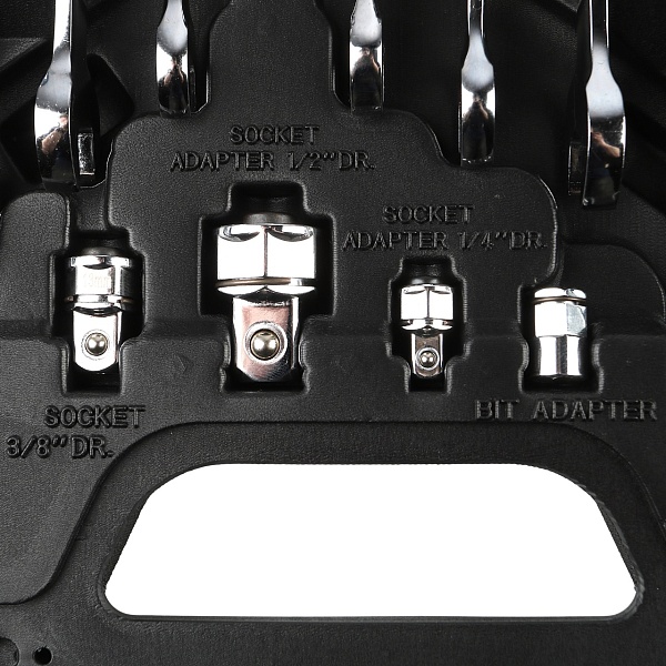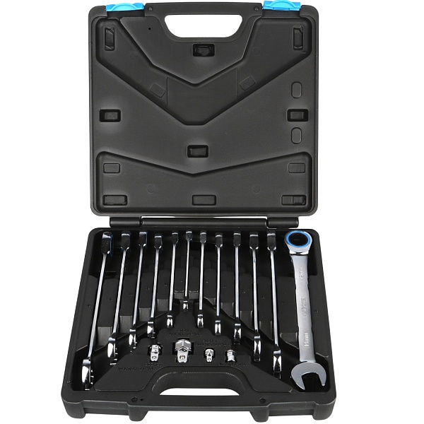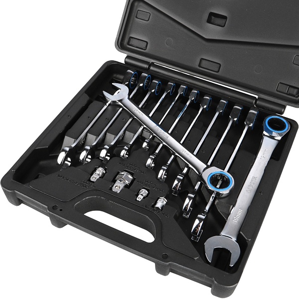 Набор комбинированных шарнирных ключей с трещоткой Licota ARW-11MK08 с рожковым и накидным профилем. Комплект состоит из 16 предметов: 12 ключей и четырёх адаптеров (три для торцевых головок и один для бит).