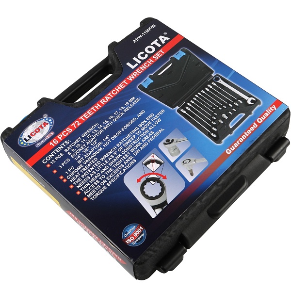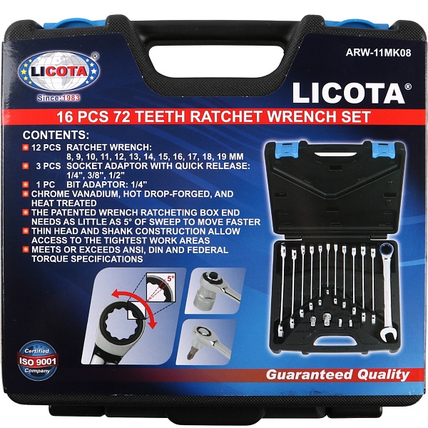 Набор ключей трещоточных комбинированных 72 зуба 8-19 мм + 4 переходника, 16 предметов в пластиковом кейсе, Licota, ARW-11MK08