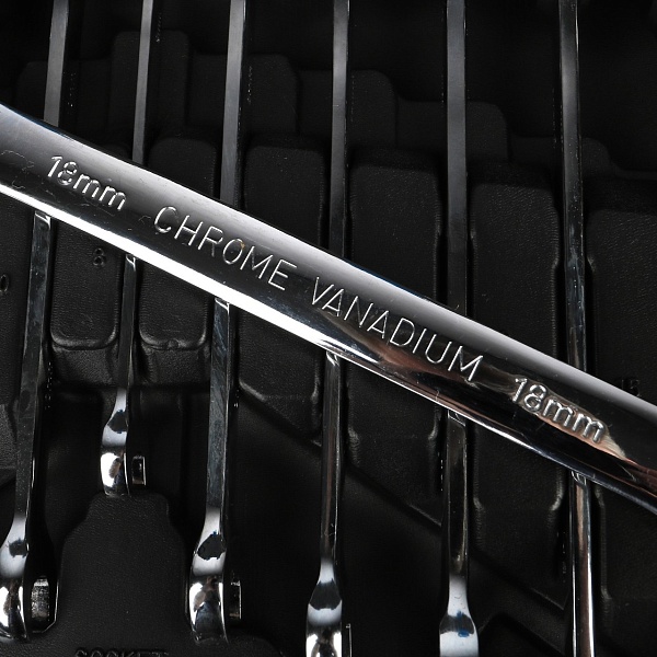 Комбинированные трещоточные ключи с шарниром в наборе выполнены из хром-ванадиевого сплава. Гальваническое покрытие из хрома, никеля и меди отполировано и дает безупречную гладкую поверхность, повышая антикоррозионные свойства ключей.