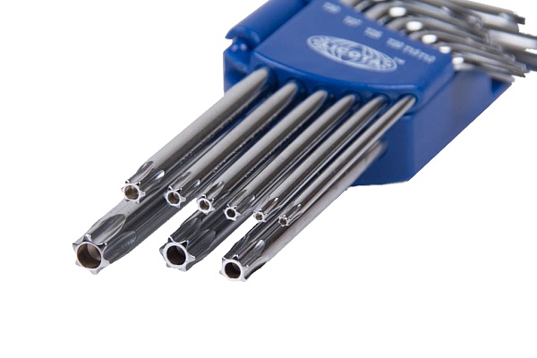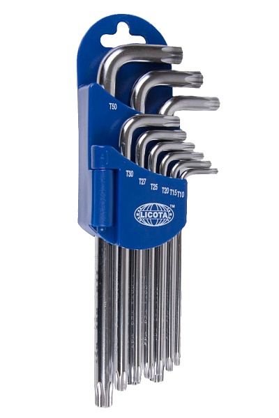 Набор ключей угловых (имбусовых) длинных Licota 2TF20091DPM для работы с крепежом с внутренним профилем Torx с отверстием. Набор из 9 ключей размерами от T10 до T50 мм.