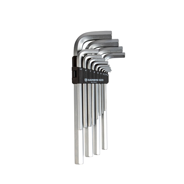 Набор ключей шестигранных угловых (имбусовых) длинных GARWIN PRO 607527 для работы с крепежом с внутренним профилем Hex. Набор из 13 ключей размерами от 2 до 19 мм.