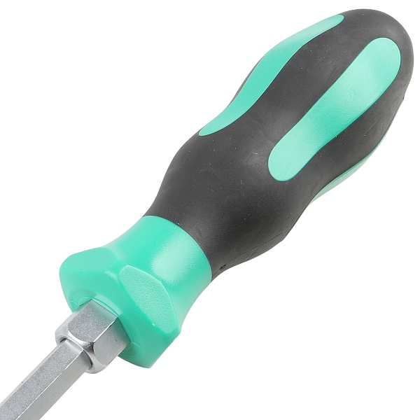 Стержень отвертки проходит через всю рукоятку и заканчивается ударным затыльником. При откручивании “закисшего” или “прикипевшего” крепежа это позволяет дополнительно прикладывать небольшие ударные нагрузки. Шестигранник между стержнем и рукояткой дает возможность использовать гаечный ключ для увеличения крутящего момента.