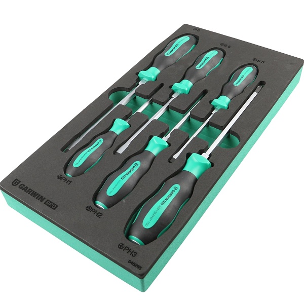 Набор цельнометаллических отверток GARWIN PRO 646265 из 6 предметов в ложементе EVA. В комплект входят 3 отвертки с профилем SL (шлиц) и 3 отвертки с профилем PH (крест).