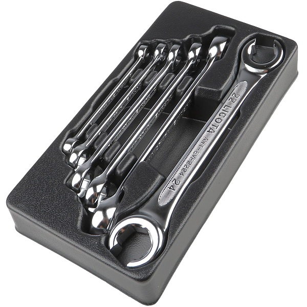 Набор разрезных рожковых ключей хранится в удобном ложементе с выемками для каждого инструмента. Он не занимает много места при хранении и перевозке, а также может быть удобно размещён в ящике верстака или тележки.