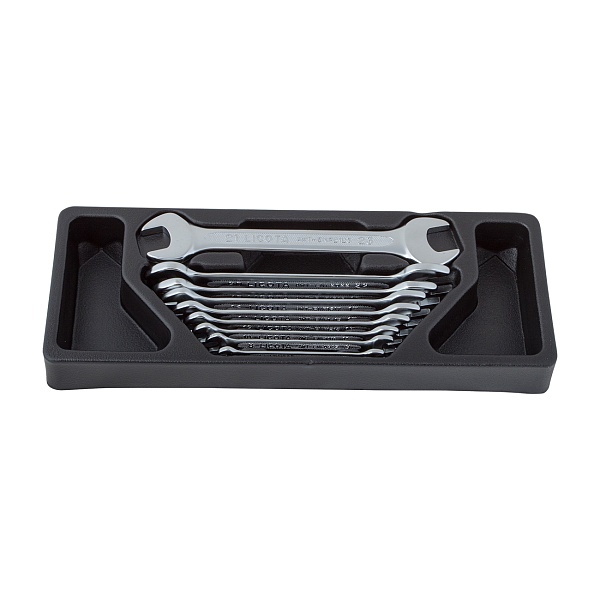 Набор гаечных рожковых ключей поставляется в удобном ложементе из пластика. Он надёжно фиксирует каждый инструментов в своей нише и не занимает много места. С ложементом набор можно удобно перевозить либо хранить в ящике тележки или верстака.