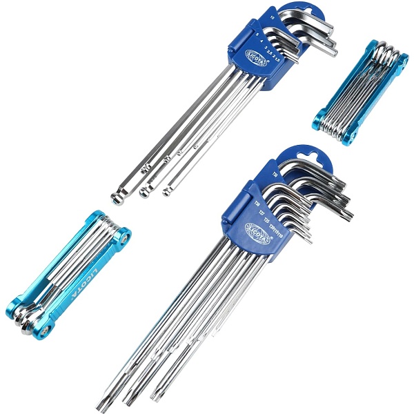 Удлиненные ключи позволяют работать с крепежом, доступ к которому обычным угловым ключом затруднен или невозможен. Сфера на длинных концах шестигранников предназначена для откручивания/закручивания крепежа под небольшим углом до 25°.
