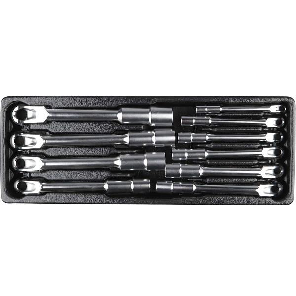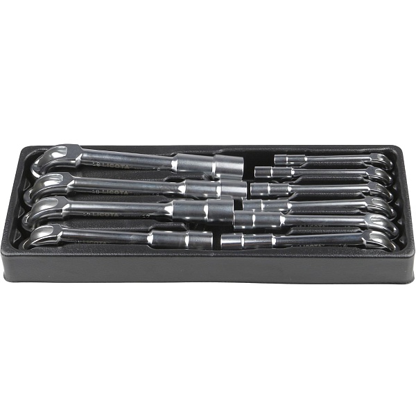 Набор гаечных ключей в ложементе удобен для хранения или перевозки. Он не занимает много места, надёжно крепит ключи в своих нишах и легко поместится в ящик инструментальной тележки или верстака.