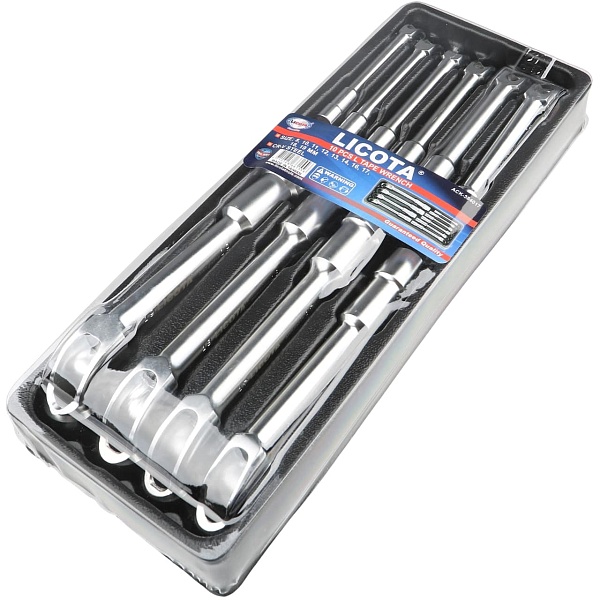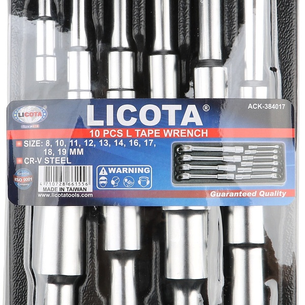 Торцевые ключи в наборе Licota ACK-384017 имеют Г-образную форму, а одна сторона ключа имеет сквозное (проходное) отверстие. Инструменты находят своё применение в слесарных мастерских, а также при домашнем обслуживании машин, поэтому пригодятся и в быту.