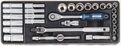 Тип и размеры головок - шестигранники от 7 до 22 мм. Размер привода — 3/8" (9,52 мм). Комплект из 30 предметов поставляется в пластиковом ложементе.