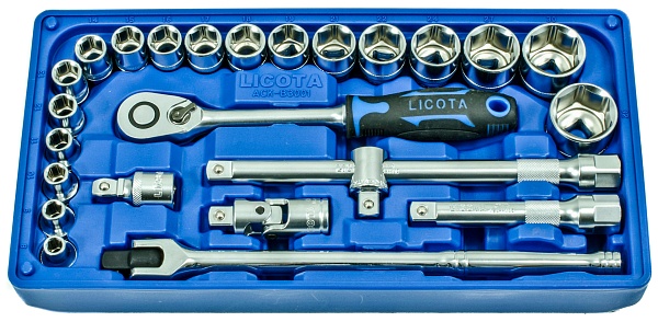 Набор торцевых головок с аксессуарами Licota ACK-B3001 из хром-ванадиевой стали предназначен для ручного монтажа/демонтажа резьбового крепежа.