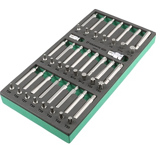 В универсальный набор входят стандартные и удлиненные биты с рабочими профилями HEX (H4-H12), Torx (T20-T70) и Spline (M5-M12). Комплект применяется при сборке-разборке узлов автомобиля и другой техники.