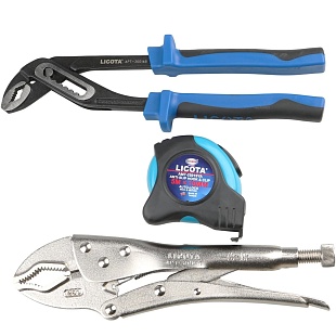 Набор: ручные тиски, переставные клещи и разводной ключ Licota ACK-B3012. Комплект губцевого инструмента из 3 предметов в ложементе из вспененного каучука (EVA). Чаще всего применяется в сантехнических работах при сборке/разборке трубных соединений.