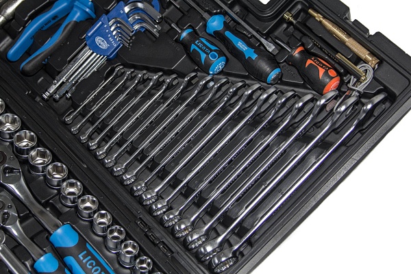 В наборе собран широкий спектр головок на 1/4”, 1/2” и 3/8”, а также аксессуаров к ним - удлинители, воротки и адаптеры. Кроме того, в него входят отвертки, молоток, шарнирно-губцевый и другой инструмент. Благодаря этому, с помощью набора можно решить практически любую задачу в быту, автосервисе или на производстве.