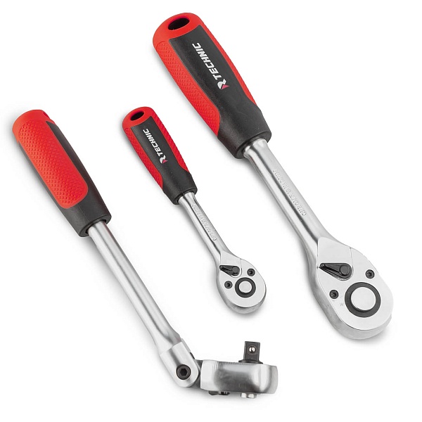 Трещотки оснащены надежным 45-зубцовым механизмом с храповым колесом из хромомолибденовой стали CrMo и двухкомпонентной маслобензостойкой ручкой.