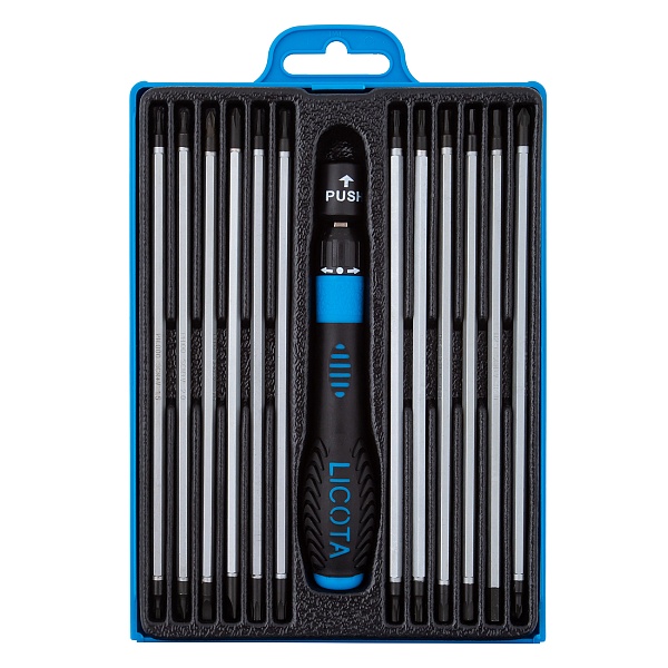 Отвертка реверсивная для точной механики в наборе со вставками Licota ASD-168K01. В комплект входит металлическая рукоятка и двенадцать сменных жал. Профиль бит - шестигранный (4 мм). Длина бит - 160 мм.