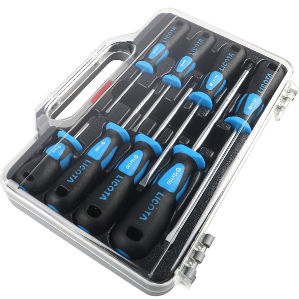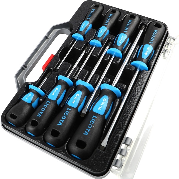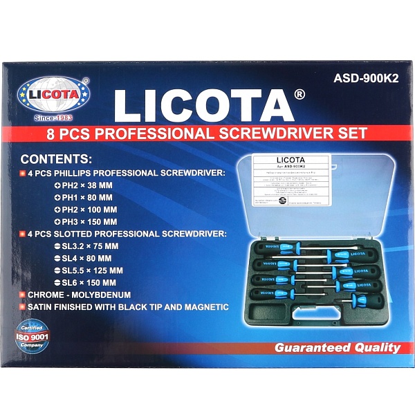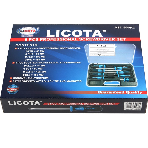 Набор профессиональных отверток Licota ASD-900K2 из 8 предметов. В комплект входят 4 отвертки с профилем SL (шлиц) и 4 отвертки с профилем PH (крест).